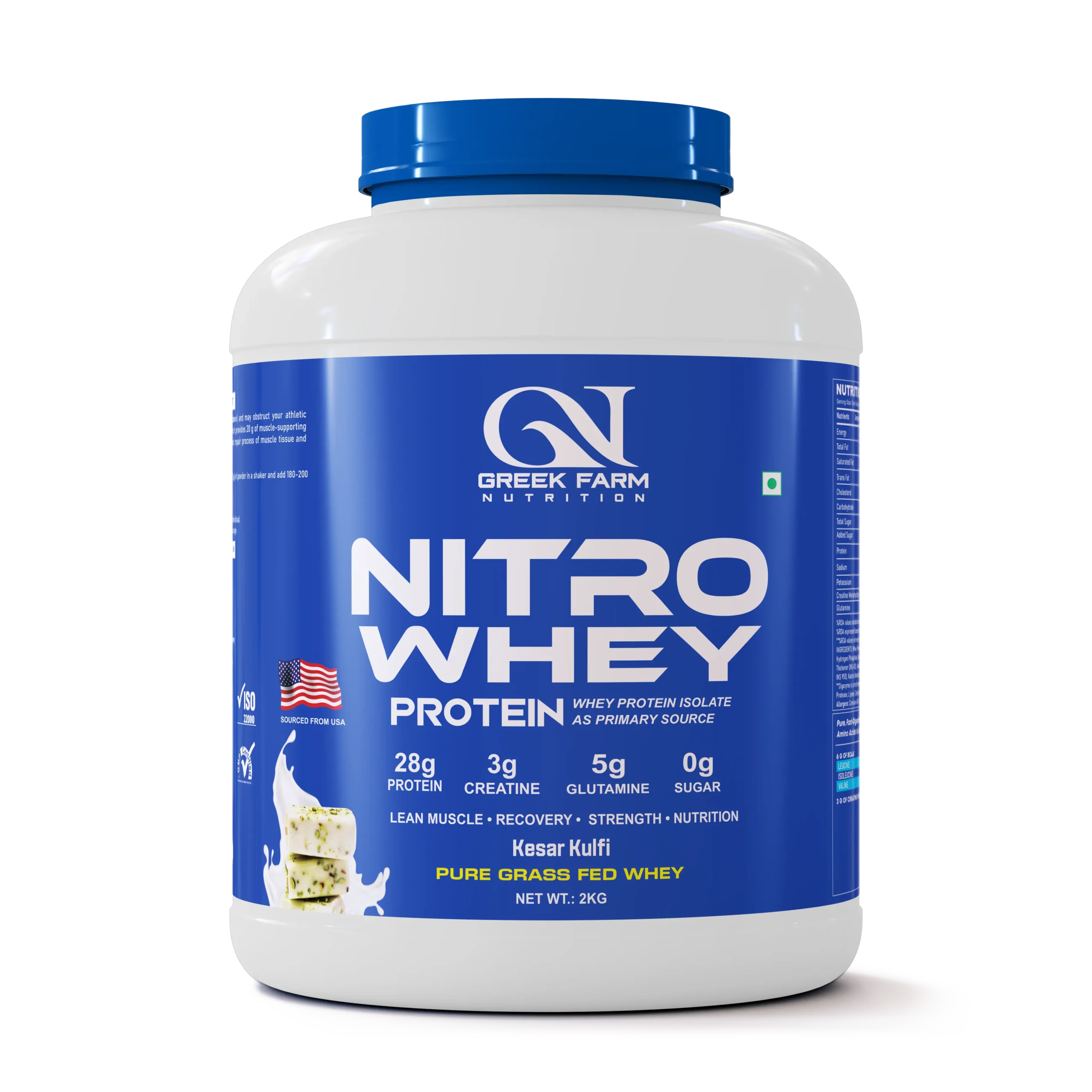 Boost your performance with Nitro Whey Protein – powered by grass-fed whey isolate, 28g protein, 5g glutamine, and 3g creatine per serving. Delicious Kesar Kulfi flavor with zero sugar – perfect for lean muscle, recovery, and strength.
