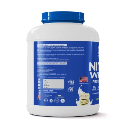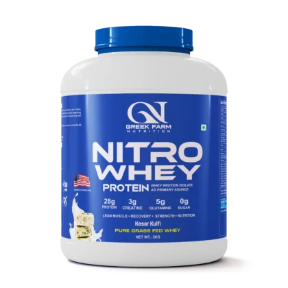 Fuel your body with Greek Farm Nutrition Nitro Whey Protein (Chocolate Flavor) – the perfect blend of whey protein isolate, creatine, and glutamine for athletes and fitness enthusiasts.